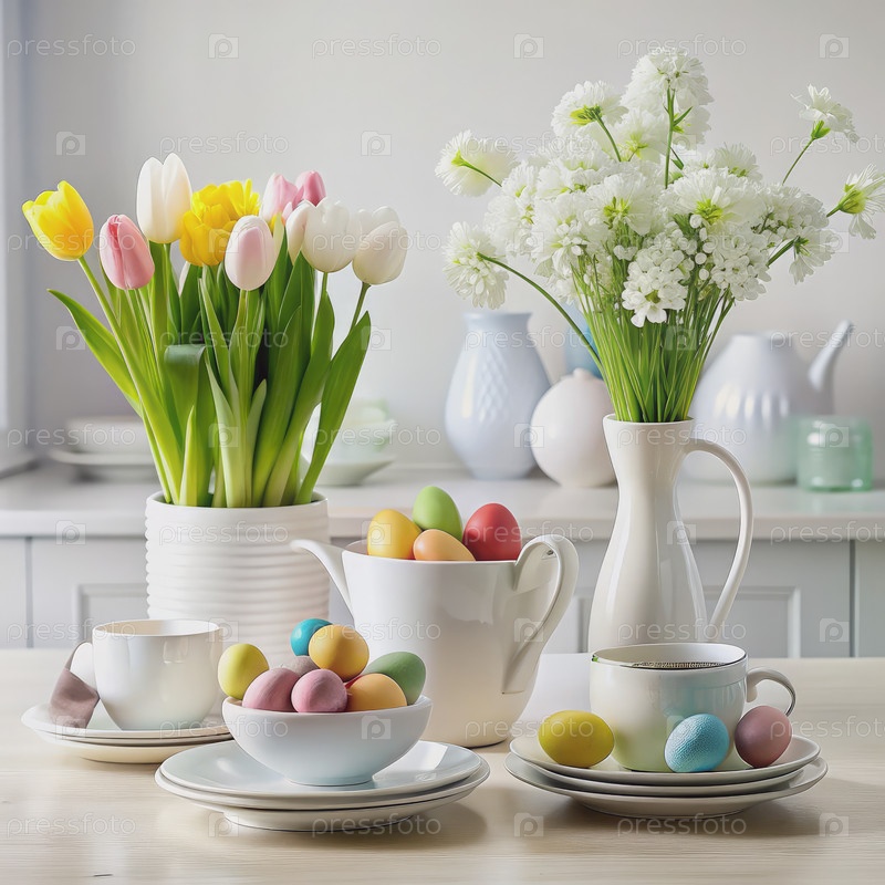 Кухонный стол с красочными пасхальными яйцами и весенними цветами. генеративная белая ИИ