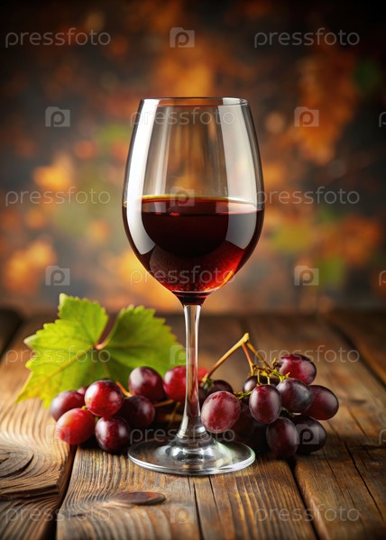 Изысканный бокал красного вина в окружении свежих виноград на деревянном столе