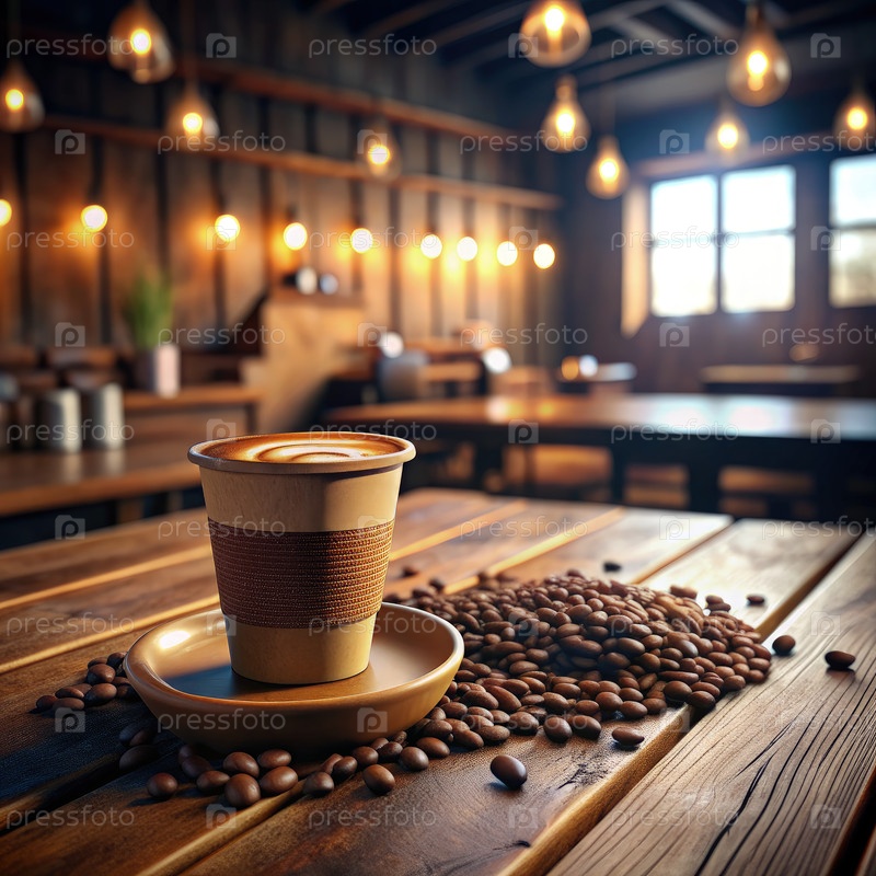 Теплая чашка для кофе расположена на деревянном столе, окруженная кофейными зернами в уютном рустик-кафе