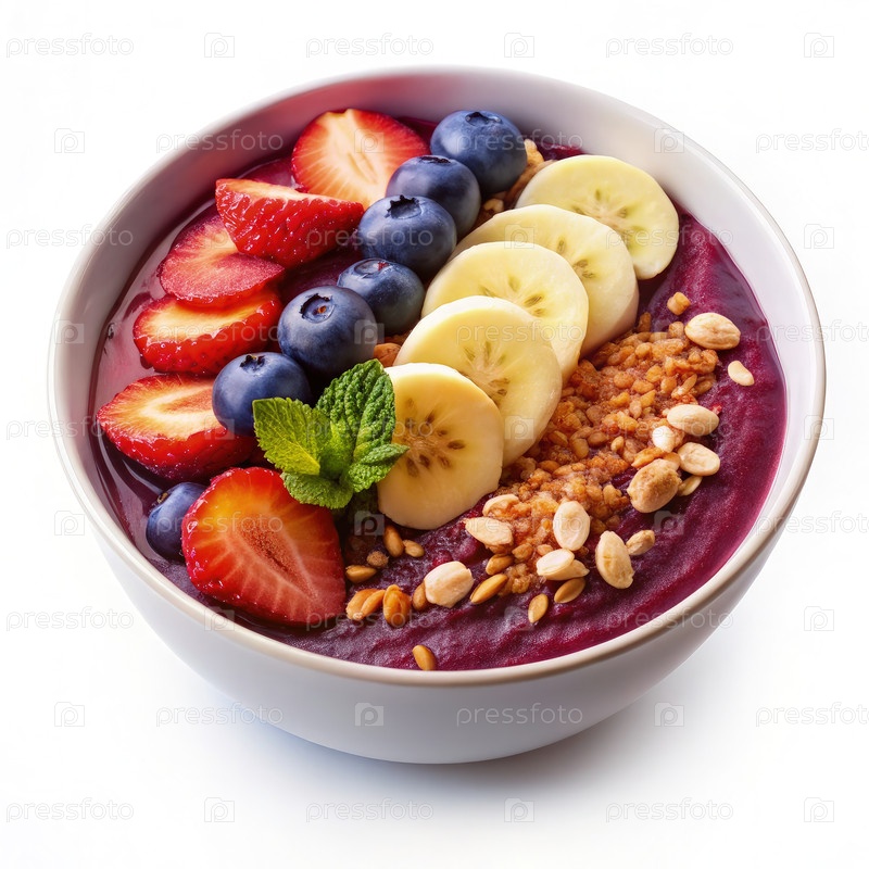 Вкусная миска с акаем, украшенная свежими фруктами и гранолой на белом блюде