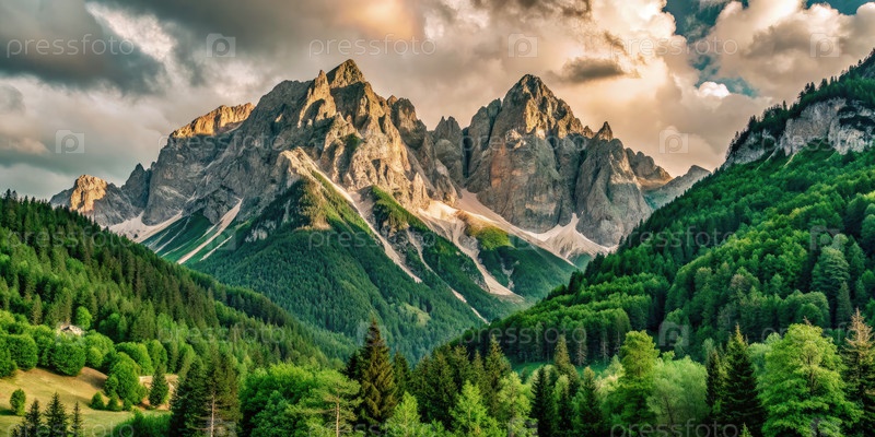 Величественные горные вершины с видом на пышные зеленые долины при закате в идиллическом пейзаже