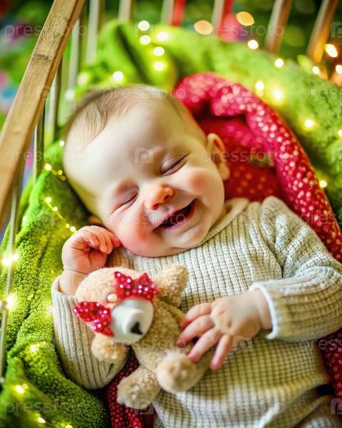 Очаровательный ребенок улыбается во время сна с медвежонком в уютной кровати, окруженный искрящимися огнями