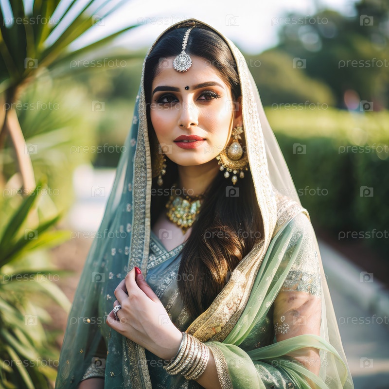 Элегантная леди в традиционных нарядах с дупатой среди пышной зелени солнечного дня