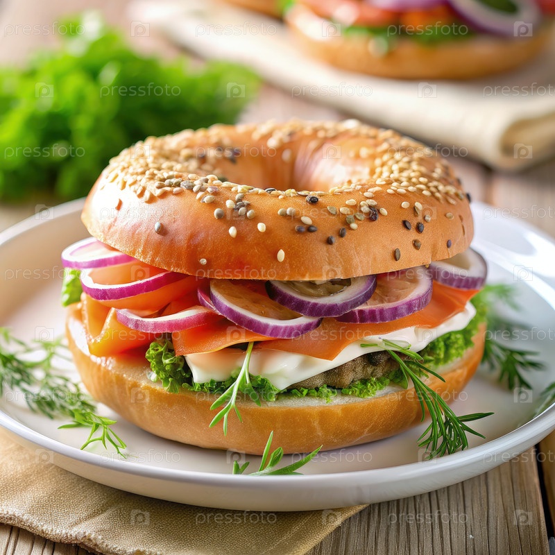 Свежеизготовленный копченый бутерброд с багелем для лосося на белой тарелке