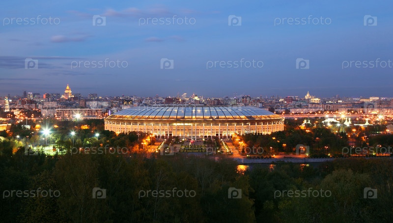 Сумерки оседают над большим стадионом с яркими огнями