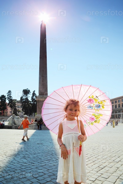 Красивая девочка рядом с обелиском на площади Пиацца-дель-Пополо в Риме