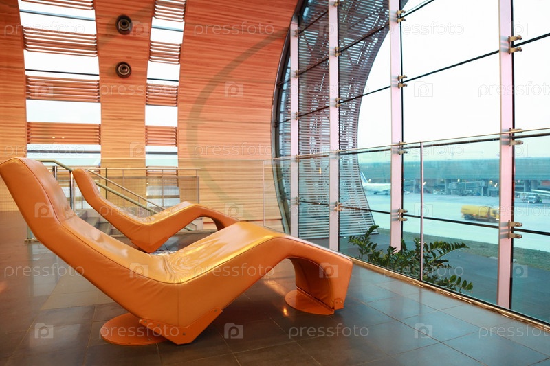 Зал ожидания в международном аэропорту, оранжевый губчатый комфортный стул