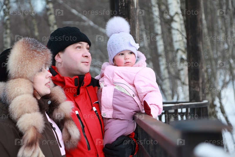 Отец обнимает мать и маленькая дочь смотрит вдаль, зимой