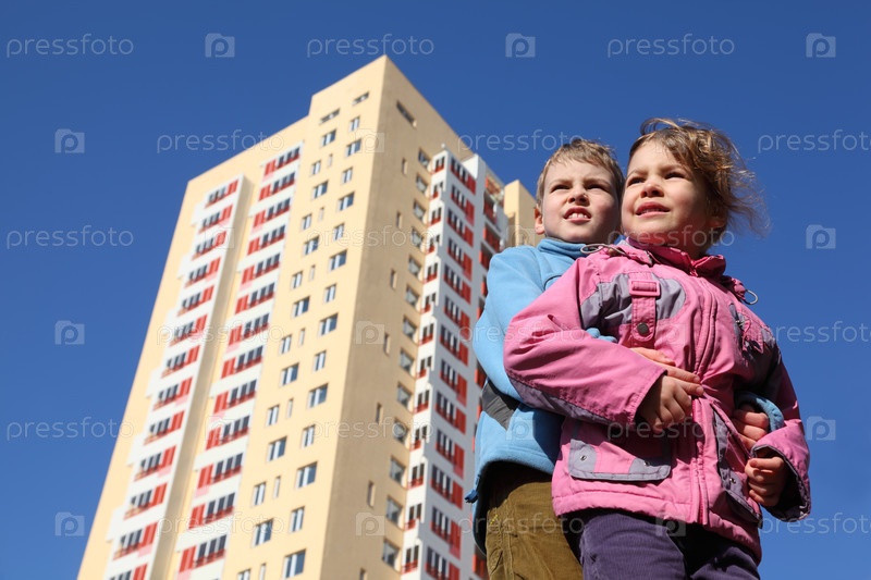 Брат обнимает младшую сестру. Девочка в розовом куртке, мальчик в синем
