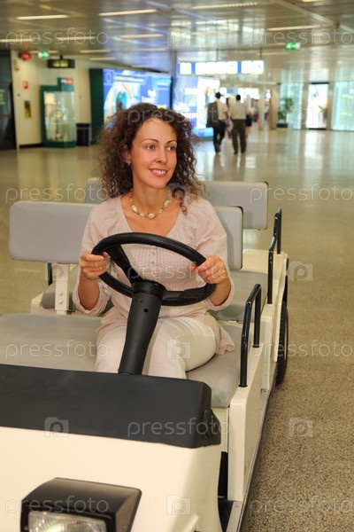 Женщина водит небольшую электрическую тележку в просторном крытом зале