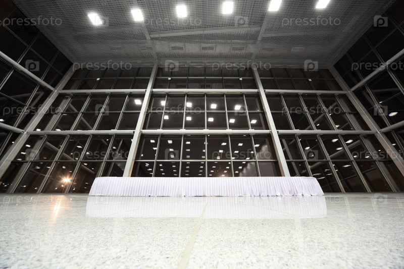 Большой стол, покрытый белой скатертью в большой просторной пустой комнате