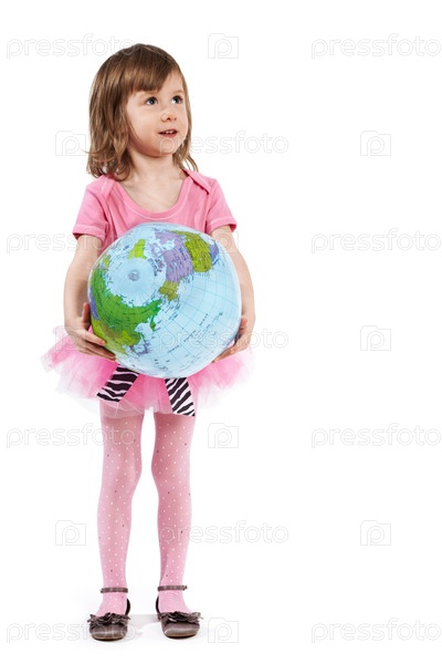 Маленькая девочка держит земной шар обеими руками