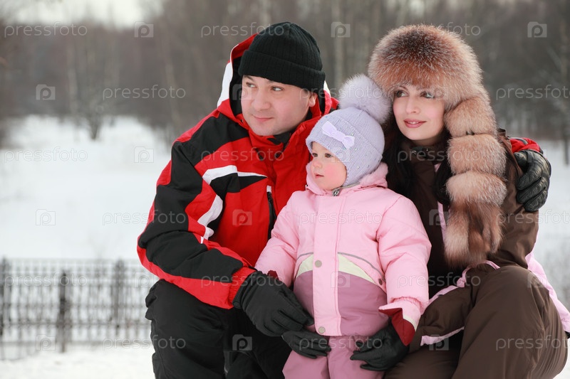 Отец обнимает мать и маленькую дочь на снегу, они смотрят внутрь