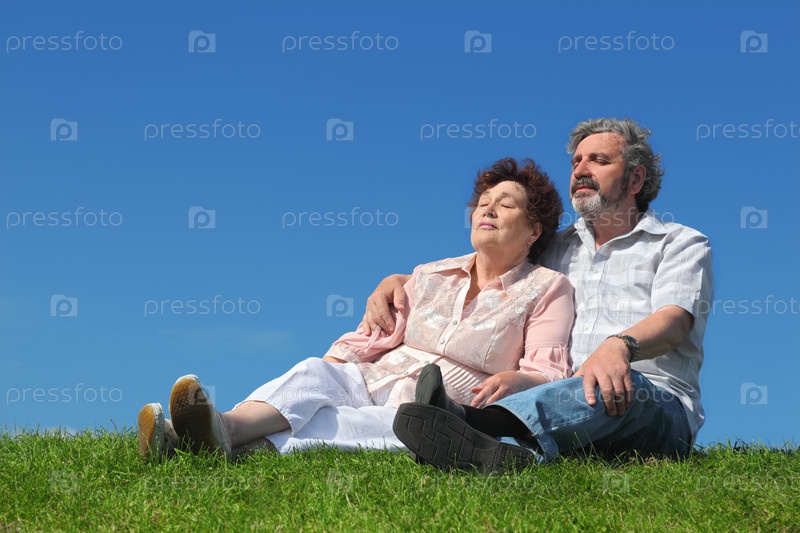 Пара отдыхает на травянистом холме под чистым голубым небом
