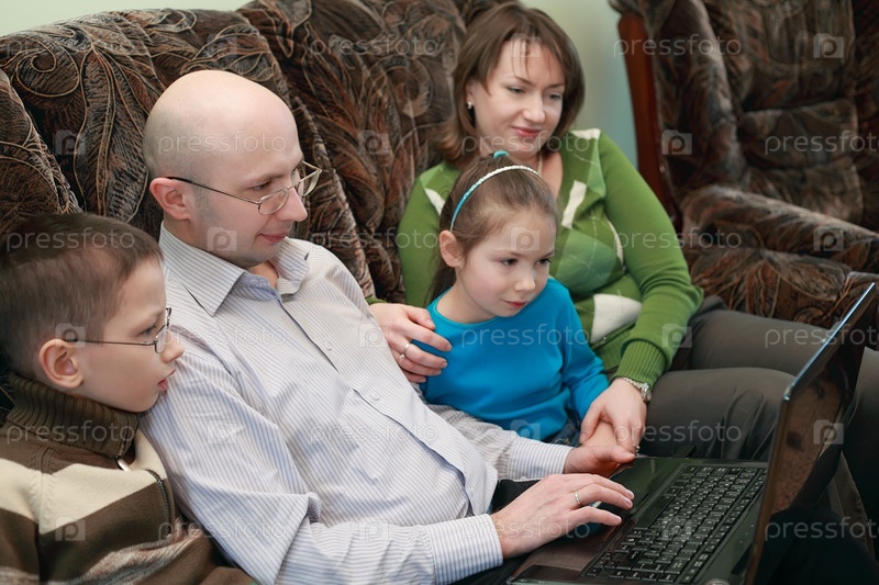 Отец, мать, сын и дочь сидят на диване и смотрят в ноутбук