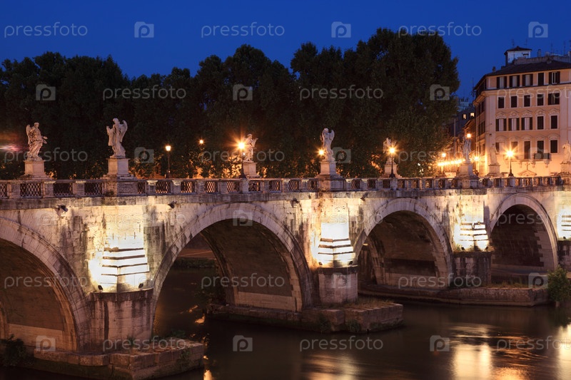 Мост Сан-Анджело ночью, красивые старые скульптуры и фонари