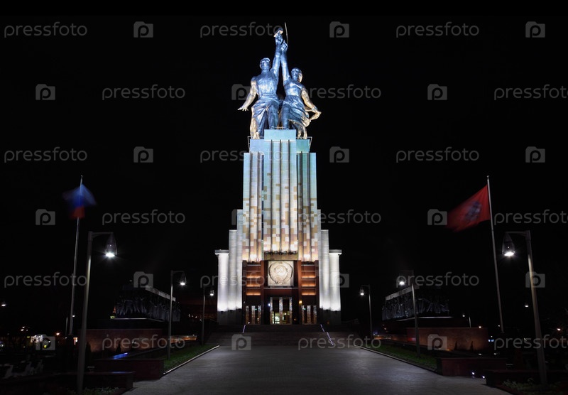 Памятник рабочему и колхозу в Москве ночью, молот и