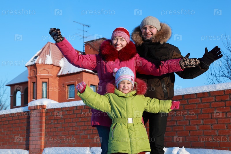 Отец, мать и дочь стоят с распростертыми руками на улице в