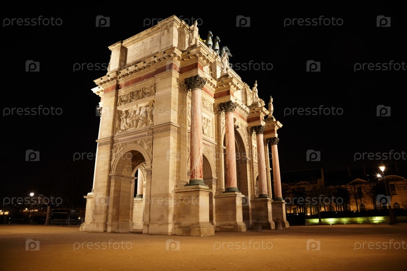 Триумфальная арка на площади Карусель в Париже ночью, вид из угла