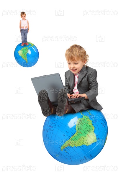 Ребенок сидит по всему миру, используя ноутбук