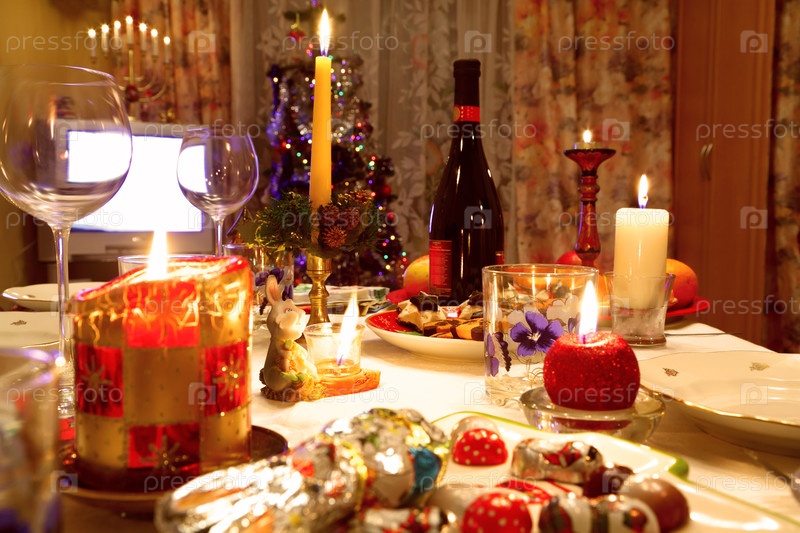 Украшенный рождественский обеденный стол со стаканами и елкой в