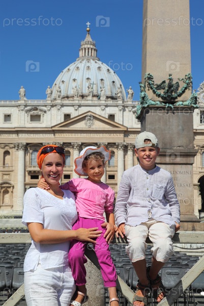 Красивая молодая мать, маленькая дочь и сын на площади Святого Петра