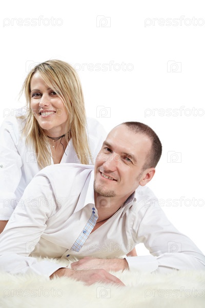 Мужчина в белой рубашке лежит на белом пушистом ковре, женщина сидит