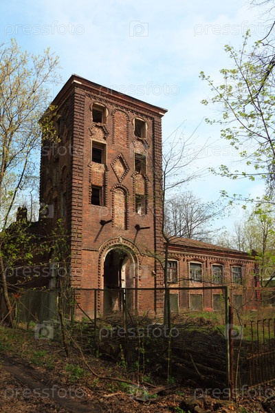 Заброшенная кирпичная башня стоит высоко за проволочным забором