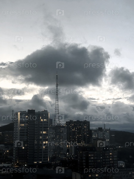 Владивосток. Вечерний силуэт города с телебашней на фоне драматических облаков