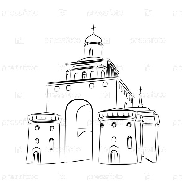 Набросок старинного храма с воротами
