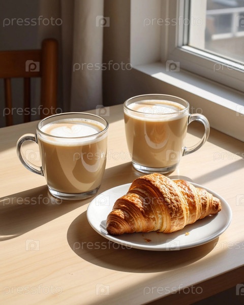 Две чашки латте с круассаном на освещенном солнцем столе