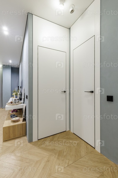 Интерьер минималистского коридора с белыми скрытыми дверями и серо-синими стенами. включает паркетный пол из дубового хрящевой кости и представление о современной гостиной со стойкой для телевизора. чистые архитектурные линии и яркое освещение