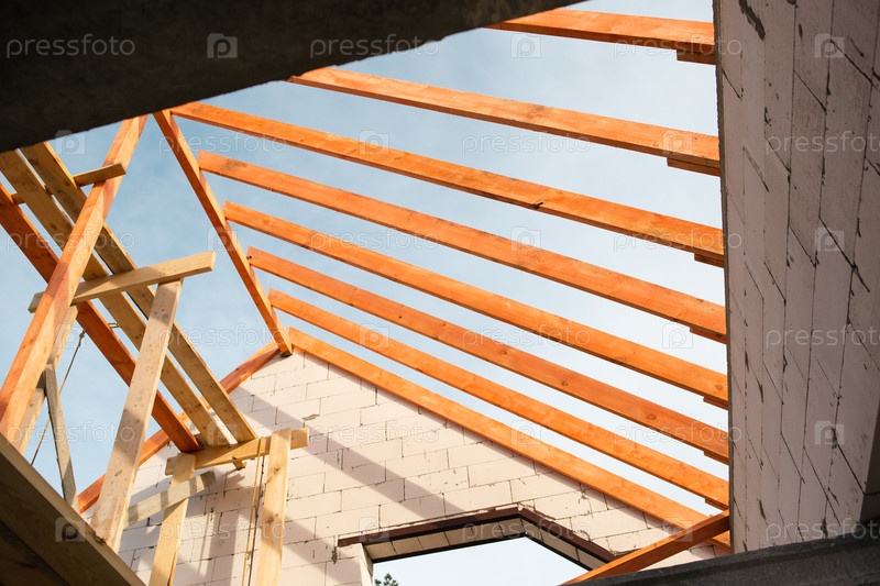 Вид на внутреннюю крышу, показывающий установку новых деревянных ограждений и задержек, современное строительство домов, поддерживаемое страховкой и ипотечным кредитом