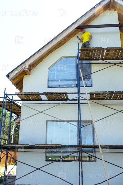 Мужчина-ремесленник стоит высоко на лесомашинах, собирая декоративный перекресток, белый фон стены, современное строительство домов на рискованной высоте