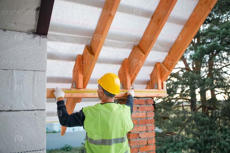 Работник закрепляет отставание крыши с помощью электрической отвертки, видимого инструмента и деревянной конструкции, процесса сборки кровли, активного строительства дома