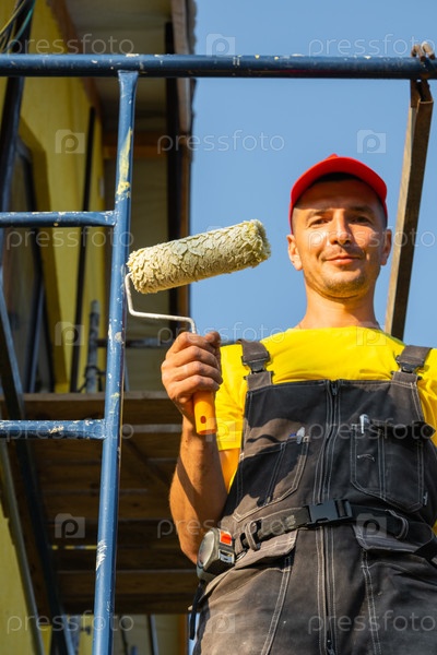 Портрет улыбающегося ремонтного работника с роликом краски, покраска стен дома, реконструкция фасада, бизнес домашнего уборщика, комплект инструментов, ремонты клиентов