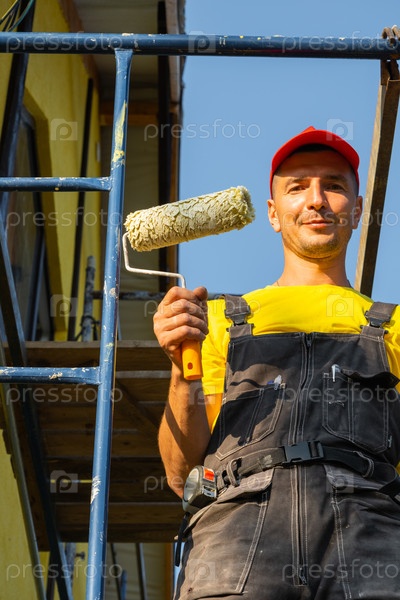 Строитель с роликом, стоящий на фарватере фасада, отделка внешних ремонтов, улучшение жилища, сервис мастера по уходу за руками, консультационный звонок, комплект инструментов, оборудование, проект