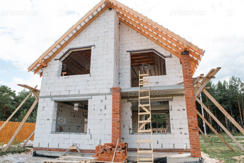 Современный каменный дом, находящийся в стадии строительства, видимые деревянные кровли и балки, активная сборка крыши завершает структурную стадию