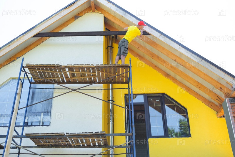 Работник на крыше края раскрашивает верхнюю фасадную балки, ярко-желтый дом, современный дизайн, безопасность подчеркнута, ремонт продолжается на высоте