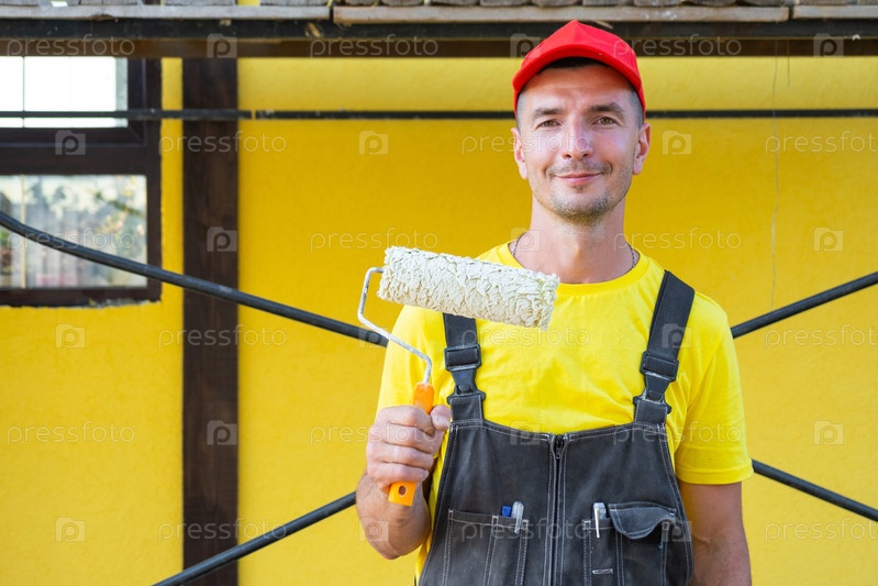 Мастер, держащий ролик краски, готов к домашним работам по покраске, ремонту стен, частному бизнесу, наборам инструментов, решениям DIY, мастерству на месте клиента