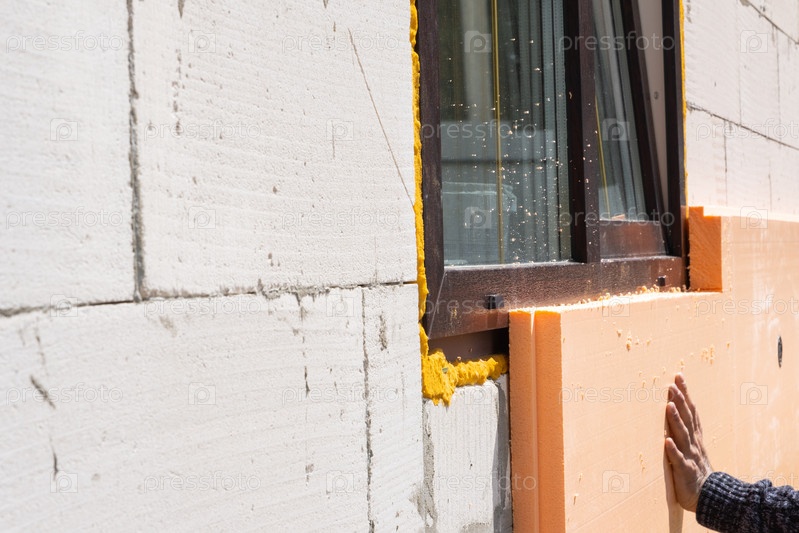Изоляция из пенопластов, прикрепленная к стене здания, тепловое обновление, энергосбережение фасада, современное облицовка, процесс установки, строительство на месте, монтаж