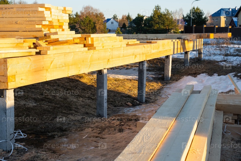 Деревянный каркас дом основание на винтовых свай, монтажная стадия, сборка фундамента, установка колодца, плотничество, строительная ступень, деревянные балки, продвижение сайта