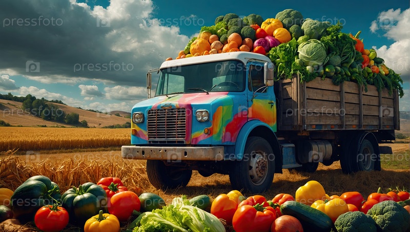 Красочный сельскохозяйственный грузовик с урожаем, загрузка овощей ? осенняя ярмарка, экорынок, местное земледелие, праздничное торжество, частный бизнес, продажа в деревне на каникулах, еда для мероприятий