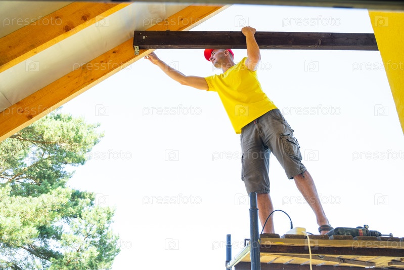 Человек в желтом фиксирует декоративную древесину на внешнем фронтоне, стоящий на высоком лесоматериале снаружи, точная отделка наружной части дома, процесс реконструкции