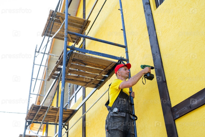 Мастер устанавливает деревянные балки на желтый фасад, в полудеревянном стиле, внешнее оформление дома, частный проект облицовки, работы по ремонту, улучшение жилища