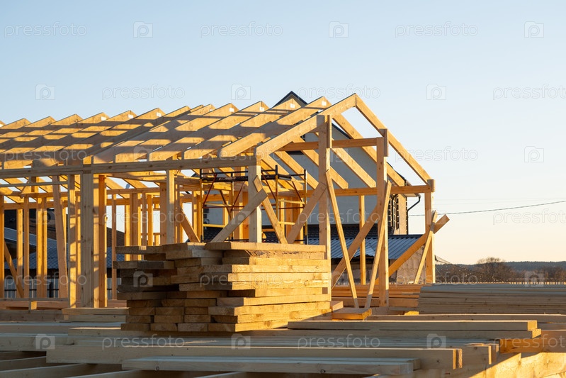 Строительство дома из деревянной рамы, монтаж древесины, сборка скелета, подкрепление, поддержка фундамента, внешняя структура, прогресс на рабочем месте, командная установка, планирование