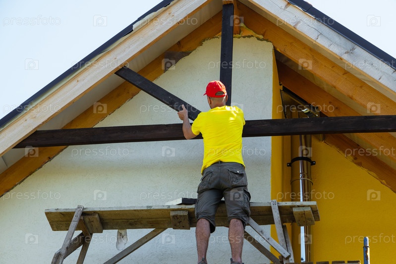 Мужской плотник прикрепляет перекрестную балки к деревянной двери дома с помощью отвертки, белой и желтой стены, сосредоточившись на мастерстве, риске высоты