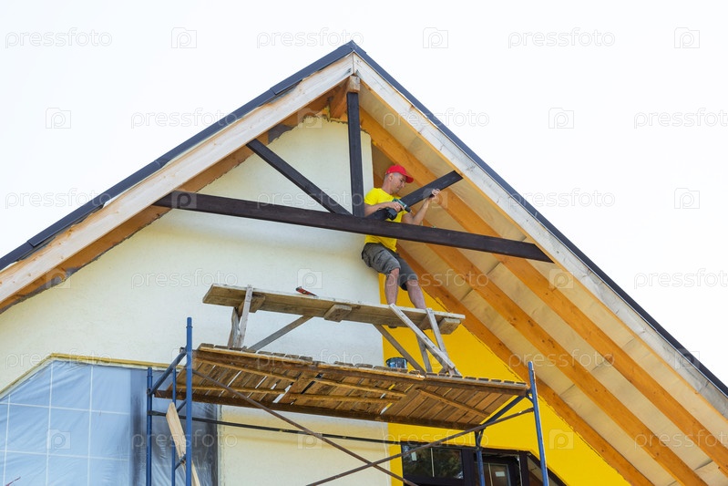 Плотник, носящий шлем, красит декоративный перекресток из гильзы с леса, видимые инструменты и оборудование, желтый современный дом, акцент на безопасности