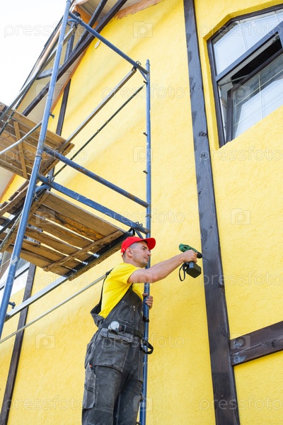 Строитель в жёлтом цвете прикрепляет деревянный декор к дому, классический вид полудревесины (fachwerk), внешнюю облицовку, улучшение фасада, реконструкцию, наружные работы