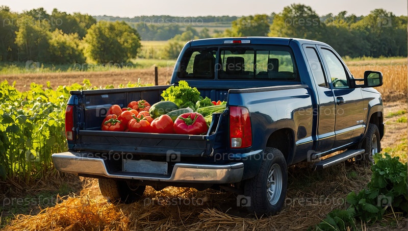 Фермерский пикап с эко-овощами ? осенний фестиваль урожая, частный фермерский бизнес, поле на рынок, свежие здоровые продукты, фургон для продаж и празднований, сельская местность собирает, органические овощи